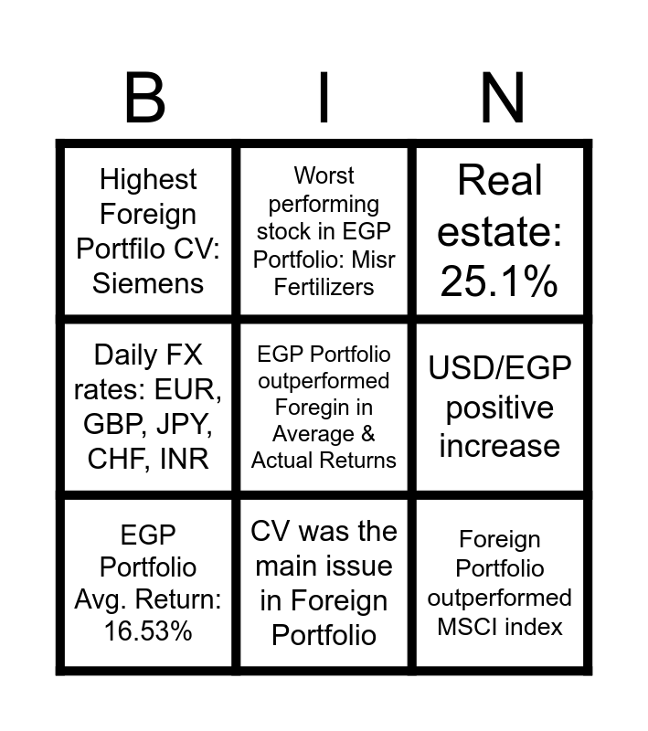 This bingo card has 9 words: EGP Portfolio Avg. Return: 16.53%, Real estate: 25.1%, Worst performing stock in EGP Portfolio: Misr Fertilizers, Daily FX rates: EUR, GBP, JPY, CHF, INR, Highest Foreign Portfilo CV: Siemens, USD/EGP positive increase, EGP Portfolio outperformed Foregin in Average & Actual Returns, Foreign Portfolio outperformed MSCI index and CV was the main issue in Foreign Portfolio.