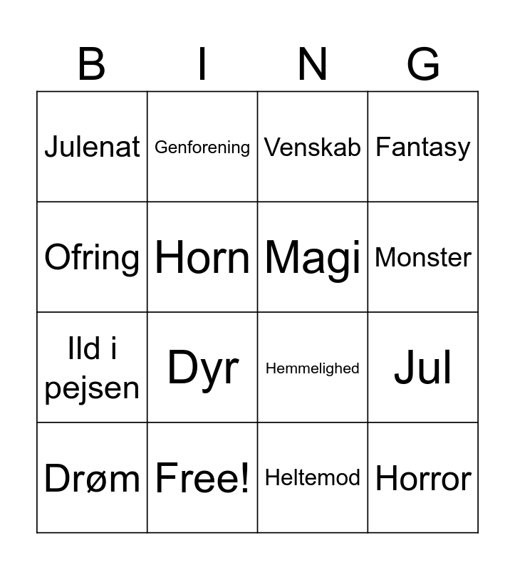 This bingo card has 25 words: Hævn, Skov, Monster, Tradition, Ofring, Julenat, Horn, Genforening, Free!, Hjem, Ild i pejsen, Hemmelighed, Håb, Kærlighed, Magi, Kongerige, Heltemod, Venskab, Dyr, Jul, Drøm, Romance, Horror, Fantasy and Varme.
