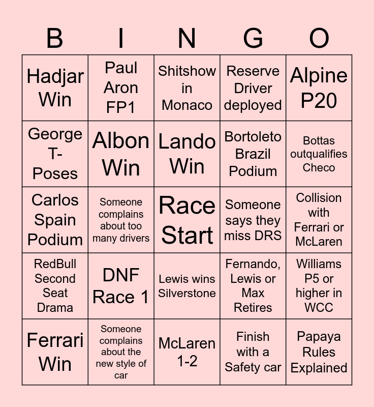 This bingo card has a free space and 24 words: DNF Race 1, Someone complains about the new style of car, Lando Win, Ferrari Win, Alpine P20, Hadjar Win, George T-Poses, Paul Aron FP1, Someone says they miss DRS, Lewis wins Silverstone, Bortoleto Brazil Podium, Carlos Spain Podium, Fernando, Lewis or Max Retires, Williams P5 or higher in WCC, Albon Win, Finish with a Safety car, Collision with Ferrari or McLaren, Shitshow in Monaco, Bottas outqualifies Checo, Someone complains about too many drivers, Papaya Rules Explained, RedBull Second Seat Drama, Reserve Driver deployed and McLaren 1-2.