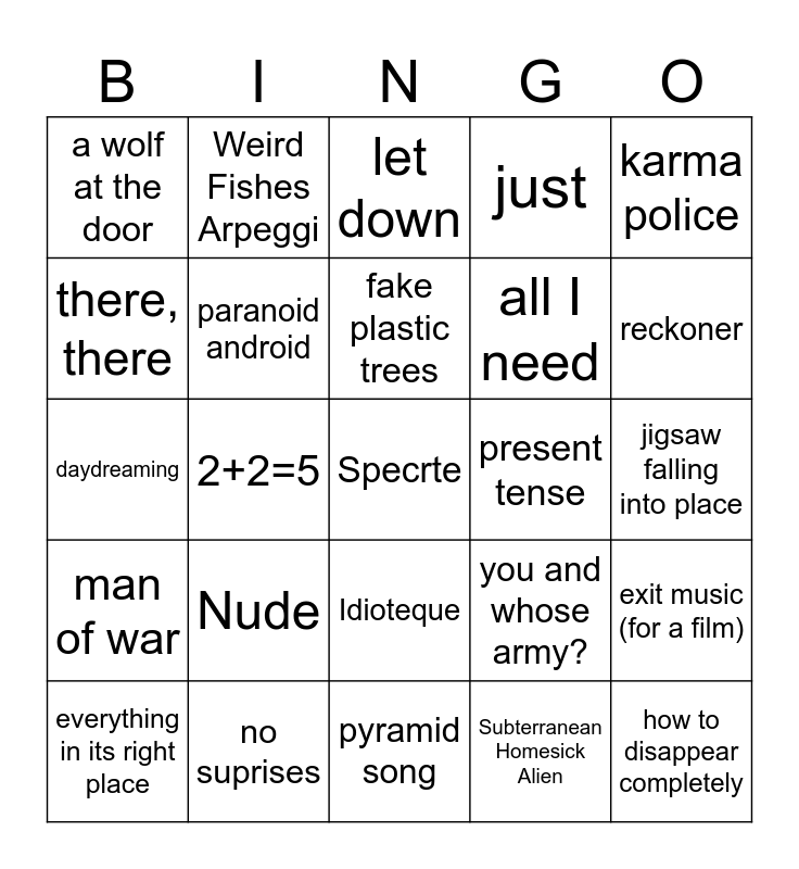 This bingo card has 25 words: Nude, pyramid song, fake plastic trees, everything in its right place, karma police, a wolf at the door, there, there, Weird Fishes Arpeggi, present tense, Idioteque, all I need, daydreaming, you and whose army?, exit music (for a film), paranoid android, how to disappear completely, jigsaw falling into place, let down, reckoner, 2+2=5, Specrte, no suprises, man of war, just and Subterranean Homesick Alien.