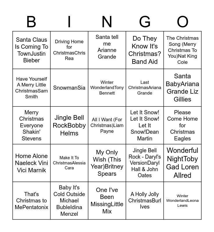 This bingo card has 84 words: Mistletoe Justin Bieber, Underneath the tree Kelly Clarkson, Santa tell me Arianne Grande, All I want for Christmas Mariah Carey, Rocking around the christa, Mistletoe Justin Bieber, Underneath the TreeKelly Clarkson, Santa Tell MeAriana Grande, All I Want for Christmas Is YouMariah Carey, Rockin' Around The Christmas TreeBrenda Lee, It's Beginning to Look a Lot like ChristmasMichael Bubble, Last ChristmasWham!, SnowmanSia, Let It Snow! Let It Snow! Let It Snow!Dean Martin, Wonderful Christmastime Paul McCartney, Santa Claus Is Coming To TownJustin Bieber, That's Christmas to MePentatonix, Have Yourself A Merry Little ChristmasSam Smith, HallelujahPentatonix, I'll Be HomeMeghan Trainor, Christmas KaboomNaeleck Sarah Rebecca, Last ChristmasAriana Grande, All I Want (For Christmas)Liam Payne, The Christmas SongJustin Bieber Usher, Jingle Bell RockBobby Helms, all i want for christmas is youEden Elf, Feliz NavidadJose Feliciano, Naughty ListLiam Payne Dixie, Holly Jolly ChristmasMichael Buble, The Christmas Song Shawn Mendes & Camila Cabelo, Make It To ChristmasAlessia Cara, O Holy NightEllie Goulding, Wonderful Dream Melanie Thornton, Merry Christmas Everyone Shakin' Stevens, Winter WonderlandLeona Lewis, Santa's Coming For UsSia, One I've Been MissingLittle Mix, Wonderful ChristmastimePentatonix, Santa BabyAriana Grande Liz Gillies, Home Alone Naeleck Vini Vici Marnik, Frosty the SnowmanMichael Buble, Baby It's Cold OutsideBrett Eldredge Meghan Trainor, Sleigh RideThe Ronettes, It's the Most Wonderful Time of the YearAndy Williams, Rudolph The Red-Nosed ReindeerDean Martin, Silent NightFrank Sinatra, Driving Home for ChristmasChris Rea, Thank God It's ChristmasQueen, Have Yourself A Merry Little ChristmasElla Fitzgerald, What Christmas Means To MeStevie Wonder, I'll Be Home for ChristmasMichael Buble, Jingle Bell Rock - Daryl's VersionDaryl Hall & John Oates, Do They Know It's Christmas? Band Aid, A Holly Jolly ChristmasBurl Ives, Happy Xmas (War Is Over) John Lennon Yoko Ono+A22, Wishlist (The Holly Jolly Edition)Laura Bryna, Baby It's Cold Outside Michael BubleIdina Menzel, Winter WonderlandTony Bennett, I Wish It Could Be Christmas EverydayWizzard, Please Come Home for Christmas Eagles, last christmasEden El, Jingle BellsMichael Buble The Puppini Sisters, Let It Snow! Let It Snow! Let It Snow! Frank Sinatra, Mary's Boy Child / Oh My LordBoney M, Run Rudolph RunChuck Berry, Christmas (Baby Please Come Home)Darlene Love, Jingle Bell RockBobby Helms, Give BackBeyond Aram49112Christmas Treats, The Christmas Song (Merry Christmas To You)Nat King Cole, Santa Can’t You Hear MeKelly Clarkson Ariana Grande, Wonderful NightToby Gad Loren Allred, All My Heroes - Radio EditNaeleck Sarah Rebecca, Merry ChristmasEd Sheeran Elton John, Step Into Christmas Elton John, My Only Wish (This Year)Britney Spears, A Holly Jolly ChristmasBurl Ives, snowmanEden Elf, No Time Like Christmas Marco Giovann, The Christmas SongOlivia Dean, Happy ChristmasRea Garvey, Single BellsJessica Sweetman, Santa's Coming for UsSia, First ChristmasDiane Keaton and Blue ChristmasZach.