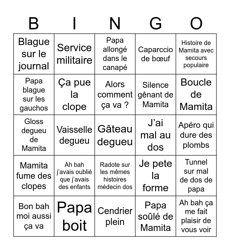 This bingo card has a free space and 24 words: Ah bah j’avais oublié que j’avais des enfants, Papa boit, Alors comment ça va ?, Bon bah moi aussi ça va, Histoire de Mamita avec secours populaire, Blague sur le journal, Papa blague sur les gauchos, Service militaire, J’ai mal au dos, Radote sur les mêmes histoires médecin dos, Silence gênant de Mamita, Gloss degueu de Mamita, Je pete la forme, Tunnel sur mal de dos de papa, Ça pue la clope, Papa soûlé de Mamita, Apéro qui dure des plombs, Papa allongé dans le canapé, Boucle de Mamita, Vaisselle degueu, Ah bah ça me fait plaisir de vous voir, Mamita fume des clopes, Caparccio de bœuf and Cendrier plein.