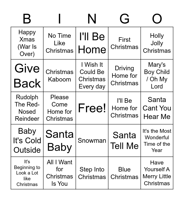 This bingo card has a free space and 61 words: A Holly Jolly Christmas, All I Want for Christmas Is You, All My Heroes, Baby It's Cold Outside, Blue Christmas, Christmas (Baby Please Come Home), Christmas Kaboom, Do They Know It's Christmas?, Driving Home for Christmas, Feliz Navidad, First Christmas, Frosty the Snowman, Give Back, Hallelujah, Happy Christmas, Happy Xmas (War Is Over), Have Yourself A Merry Little Christmas, Holly Jolly Christmas, Home Alone, I Wish It Could Be Christmas Every day, I'll Be Home for Christmas, I'll Be Home, It's Beginning to Look a Lot like Christmas, It's the Most Wonderful Time of the Year, Jingle Bell Rock, Last Christmas, Let It Snow! Let It Snow! Let It Snow!, Make It To Christmas, Mary's Boy Child / Oh My Lord, Merry Christmas Everyone, Merry Christmas, Mistletoe, My Only Wish, Naughty List, No Time Like Christmas, O Holy Night, One I've Been Missing, Please Come Home for Christmas, Rockin' Around The Christmas Tree, Rudolph The Red-Nosed Reindeer, Run Rudolph Run, Santa Baby, Santa Cant You Hear Me, Santa Claus Is Coming To Town, Santa Tell Me, Santa's Coming For Us, Silent Night, Single Bells, Sleigh Ride, Snowman, Step Into Christmas, Thank God It's Christmas, That's Christmas to Me, The Christmas Song, Underneath the Tree, What Christmas Means To Me, Winter Wonderland, Wishlist, Wonderful Christmastime, Wonderful Dream and Wonderful Night.