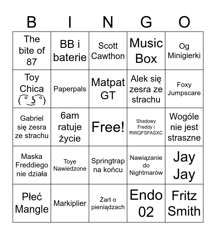 This bingo card has a free space and 24 words: Toye Nawiedzone, Markiplier, Matpat GT, Płeć Mangle, Og Minigierki, The bite of 87, Toy Chica ( ͡° ͜ʖ ͡°), BB i baterie, Shadowy Freddy i RWQFSFASXC, Springtrap na końcu, Alek się zesra ze strachu, Gabriel się zesra ze strachu, Nawiązanie do Nightmarów, Jay Jay, Paperpals, Endo 02, Wogóle nie jest straszne, Scott Cawthon, Foxy Jumpscare, 6am ratuje życie, Fritz Smith, Maska Freddiego nie działa, Music Box and Żart o pieniądzach.