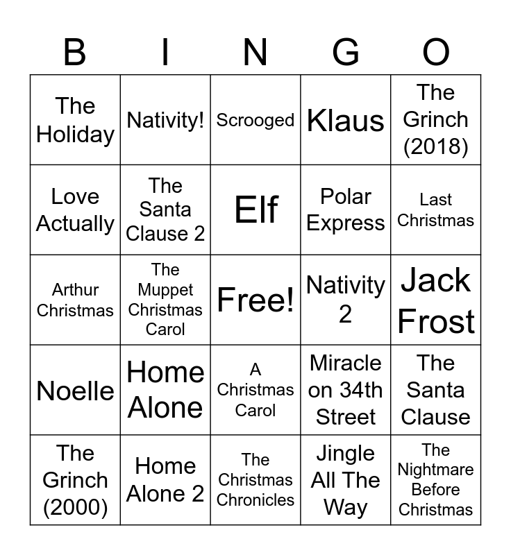 This bingo card has a free space and 24 words: Home Alone, Home Alone 2, Elf, The Grinch (2000), The Grinch (2018), The Holiday, Love Actually, Nativity!, Nativity 2, A Christmas Carol, Polar Express, Arthur Christmas, Miracle on 34th Street, The Santa Clause, The Santa Clause 2, Jingle All The Way, Jack Frost, Scrooged, Last Christmas, The Muppet Christmas Carol, The Nightmare Before Christmas, Noelle, Klaus and The Christmas Chronicles.