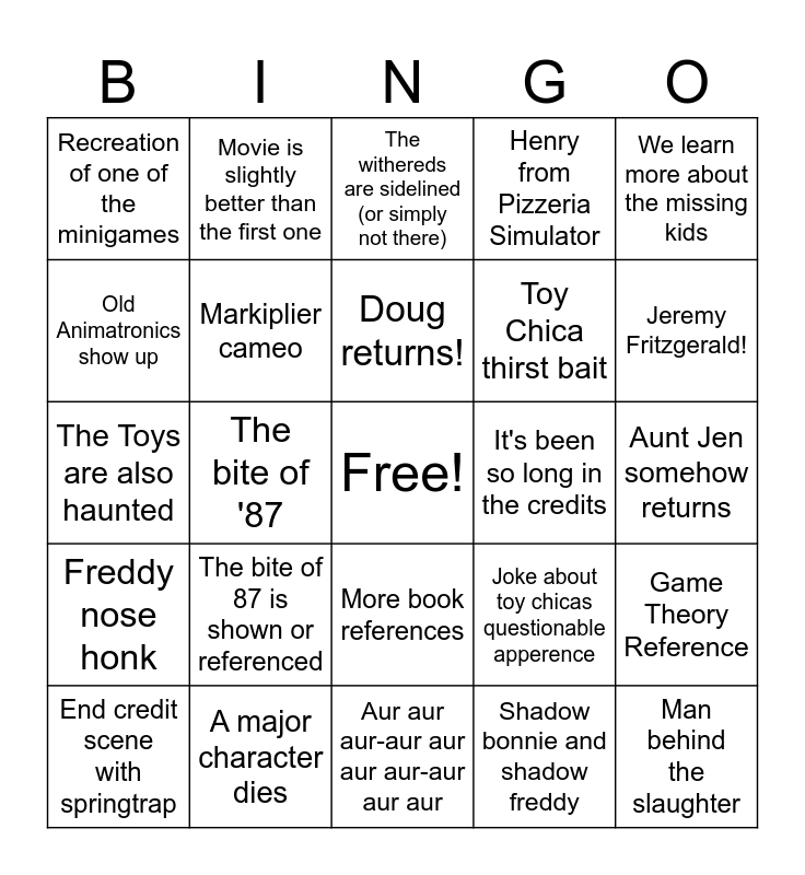 This bingo card has a free space and 34 words: Henry is still nowhere to be seem, Shadow bonnie and shadow freddy, Vanessa is still sketch, Lots of eastereggs and fanservice, Freddy nose honk, Markiplier cameo, We learn more about the missing kids, End credit scene with springtrap, Movie is slightly better than the first one, BB takes the guards batteries or flashlight, Doug returns!, The withereds are sidelined (or simply not there), Joke about mangles gender, We actually actually get to see how the pizzeria operates in the day, It's been so long in the credits, Jeremy Fritzgerald!, A major character dies, The Toys are also haunted, The bite of 87 is shown or referenced, Joke about toy chicas questionable apperence, More book references, Golden Freddy has a larger role, Recreation of one of the minigames, Aunt Jen somehow returns, Aur aur aur-aur aur aur aur-aur aur aur, Man behind the slaughter, Henry from Pizzeria Simulator, Sister Location Reference, Toy Chica thirst bait, Old Animatronics show up, Springtrap reference, The bite of '87, Game Theory Reference and A good script?!.