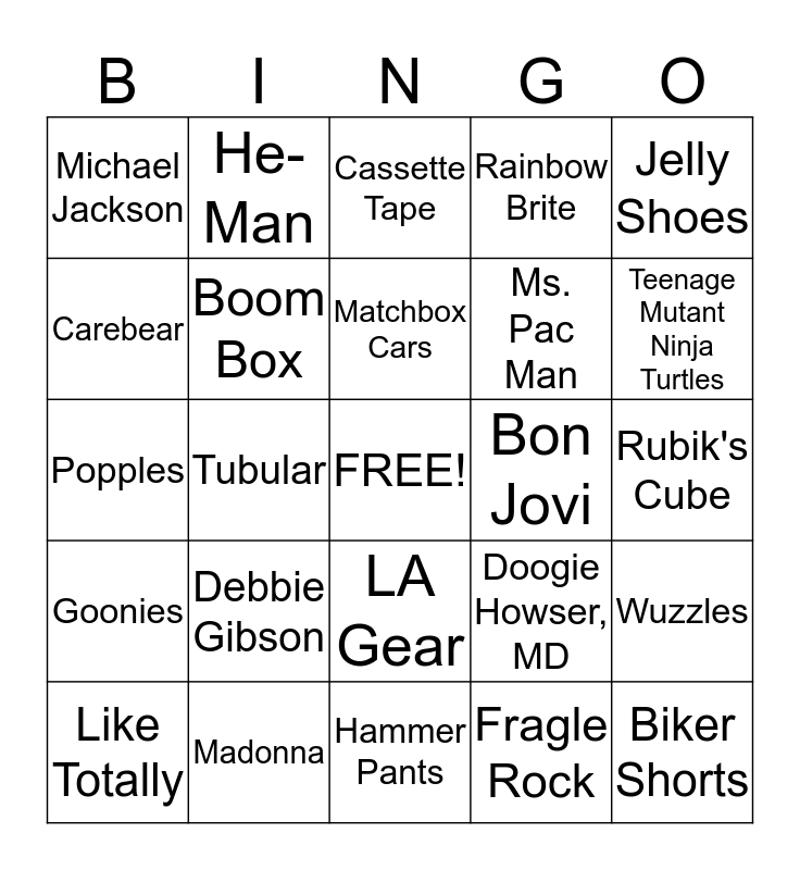 This bingo card has a free space and 29 words: Like Totally, Dude, Tubular, Cabbage Patch Kids, Michael Jackson, Cassette Tape, Boom Box, Debbie Gibson, Bon Jovi, Madonna, Rubik's Cube, Biker Shorts, Hammer Pants, Fragle Rock, Teenage Mutant Ninja Turtles, Pretty in Pink, LA Gear, Goonies, Jelly Shoes, Popples, Doogie Howser, MD, Banana Clip, Ms. Pac Man, Carebear, Rainbow Brite, He-Man, Wuzzles, Matchbox Cars and E.T..
