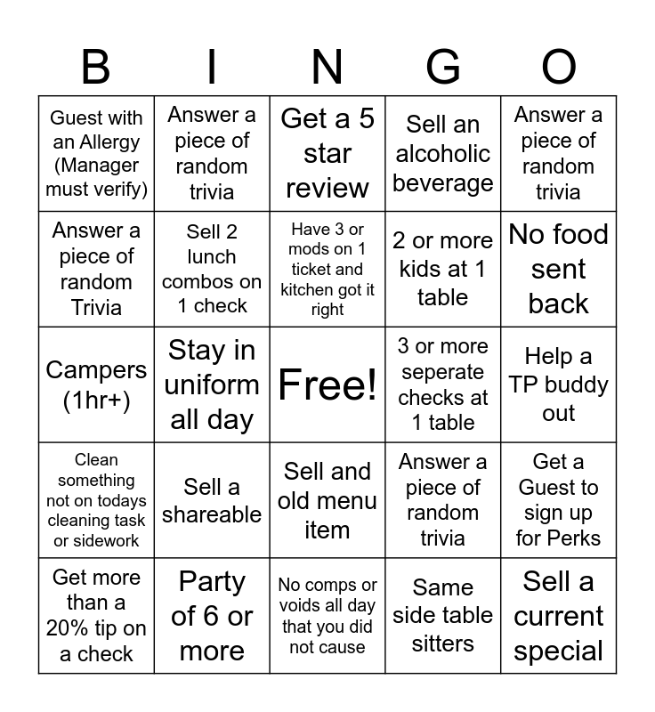 This bingo card has a free space and 24 words: Get more than a 20% tip on a check, Sell a shareable, Have 3 or mods on 1 ticket and kitchen got it right, Same side table sitters, Answer a piece of random trivia, Guest with an Allergy (Manager must verify), Answer a piece of random trivia, Get a 5 star review, 3 or more seperate checks at 1 table, Help a TP buddy out, Campers (1hr+), Sell 2 lunch combos on 1 check, Answer a piece of random trivia, Get a Guest to sign up for Perks, Answer a piece of random Trivia, Party of 6 or more, No comps or voids all day that you did not cause, Sell an alcoholic beverage, No food sent back, Clean something not on todays cleaning task or sidework, Stay in uniform all day, Sell and old menu item, 2 or more kids at 1 table and Sell a current special.
