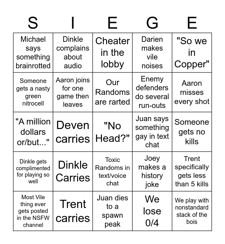 This bingo card has 45 words: "Ubisoft/Siege Sux", "No Head?", "Bad Aim", Most Vile thing ever gets posted in the NSFW channel, We win 4/0, We lose 0/4, Cheater in the lobby, Dinkle gives an awful, stinky callout, "So we in Copper", Trent carries, Darien makes vile noises, Juan says something gay in text chat, Toxic Randoms in text/voice chat, Dinkle Carries, Someone Aces, Juan dies to a spawn peak, Dinkle gets actually heated, "A million dollars or/but...", Dinkle misses every shot, Aaron misses every shot, Dinkle complains about audio, Juan Carries, Aaron/Dinkle's cat make a cameo, Michael says something brainrotted, Joey Carries, Someone gets no kills, Someone clutches a 3-5 v 1, Joey makes a food joke, Joey makes a history joke, Dinkle gets complimented for playing so well, Juan specifically gets less than 5 kills, Trent specifically gets less than 5 kills, Trent's Daughter makes a cameo, Michael makes a cameo (Only if he isn't playing), Someone makes a joke about masturbation, Deven carries, Deven misses every shot, Deven makes a rancid callout, We play with nonstandard stack of the bois, Our Randoms are rarted, Someone gets a nasty green nitrocell, Enemy defenders do several run-outs, Someone's internet makes a big stinky, Aaron joins for one game then leaves and Michael makes a Valorant reference.
