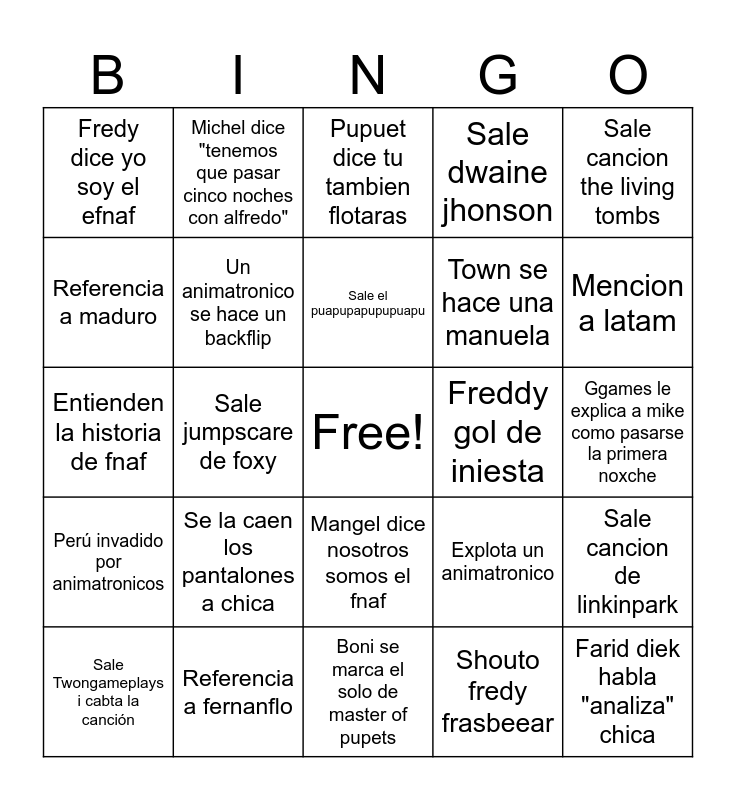 This bingo card has a free space and 24 words: Sale Twongameplays i cabta la canción, Se la caen los pantalones a chica, Sale el puapupapupupuapu, Shouto fredy frasbeear, Sale cancion the living tombs, Fredy dice yo soy el efnaf, Michel dice "tenemos que pasar cinco noches con alfredo", Pupuet dice tu tambien flotaras, Freddy gol de iniesta, Ggames le explica a mike como pasarse la primera noxche, Entienden la historia de fnaf, Un animatronico se hace un backflip, Explota un animatronico, Sale cancion de linkinpark, Referencia a maduro, Referencia a fernanflo, Boni se marca el solo de master of pupets, Sale dwaine jhonson, Mencion a latam, Perú invadido por animatronicos, Sale jumpscare de foxy, Mangel dice nosotros somos el fnaf, Town se hace una manuela and Farid diek habla "analiza" chica.