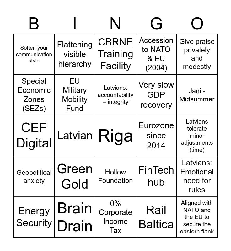 This bingo card has a free space and 24 words: Green Gold, Brain Drain, Latvians: accountability = integrity, Energy Security, Give praise privately and modestly, Soften your communication style, Special Economic Zones (SEZs), Flattening visible hierarchy, Eurozone since 2014, Hollow Foundation, Very slow GDP recovery, CEF Digital, FinTech hub, Latvians: Emotional need for rules, EU Military Mobility Fund, Rail Baltica, Latvians tolerate minor adjustments (time), CBRNE Training Facility, Jāņi - Midsummer, Latvian, Aligned with NATO and the EU to secure the eastern flank, Geopolitical anxiety, Accession to NATO & EU (2004) and 0% Corporate Income Tax.