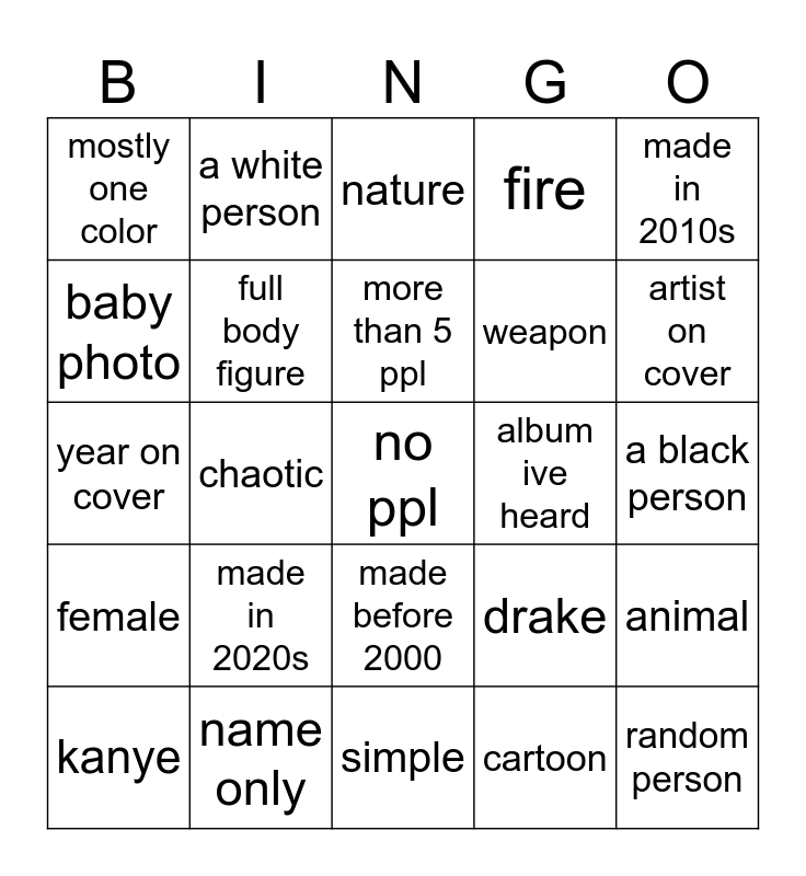 This bingo card has a free space and 24 words: made in 2020s, name only, more than 5 ppl, kanye, made in 2010s, mostly one color, baby photo, a white person, album ive heard, made before 2000, weapon, year on cover, drake, animal, full body figure, cartoon, a black person, nature, artist on cover, chaotic, random person, female, fire and simple.