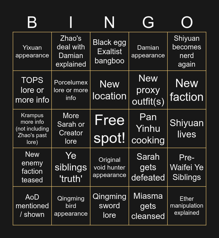 This bingo card has a free space and 24 words: Ye siblings 'truth', Qingming bird appearance, New location, AoD mentioned / shown, Shiyuan becomes nerd again, Yixuan appearance, TOPS lore or more info, Zhao's deal with Damian explained, Pan Yinhu cooking, Original void hunter appearance, New proxy outfit(s), Krampus more info (not including Zhao's past lore), Sarah gets defeated, Pre-Waifei Ye Siblings, Porcelumex lore or more info, Miasma gets cleansed, Shiyuan lives, Black egg Exaltist bangboo, New faction, More Sarah or Creator lore, Ether manipulation explained, New enemy faction teased, Damian appearance and Qingming sword lore.