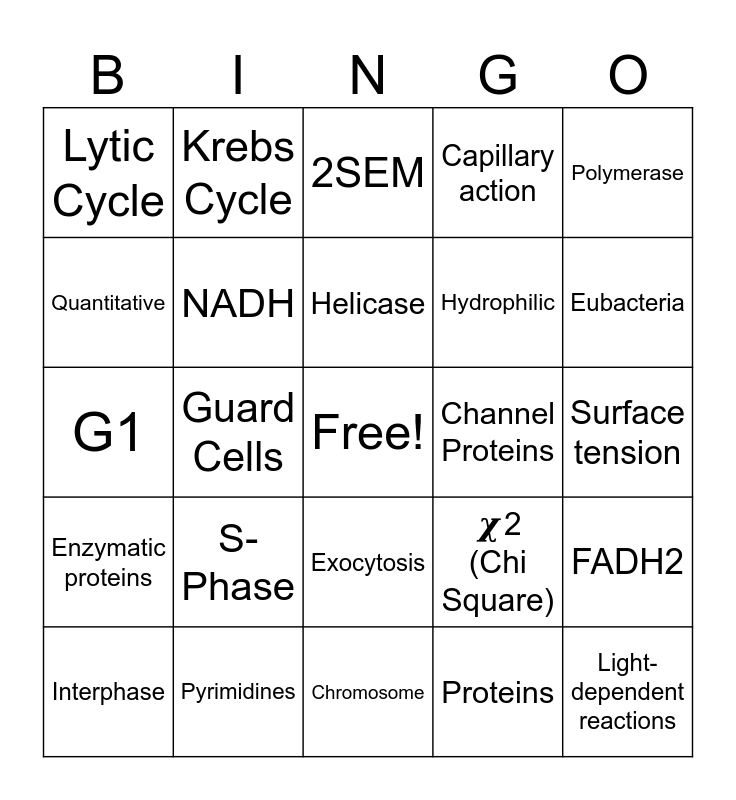 This bingo card has a free space and 161 words: Hypothesis, Independent variable, Dependent variable, Constant, Control Group, Experimental Group, Observation, Inference, Scientific Theories, Scientific Laws, Quantitative, Qualitative, 2SEM, STDEV, 𝝌2 (Chi Square), Prokaryotic, Eukaryotic, Endosymbiotic Theory, Biotic, Abiotic, Organelle, Homeostasis, Metabolism, Nucleic Acid, Vaccine, Antibiotic, Lytic Cycle, Lysogenic Cycle, Pathogen, Phage, Host cell, Viral Capsid, Surface Markers, Prokaryote, Eukaryote, Autotroph, Heterotroph, Multicellular, Unicellular, Archaebacteria, Eubacteria, Protista, Fungi, Asexual Reproduction, Sexual Reproduction, Enzyme, Active Site, Substrate, Activation energy, Monomer, Polymer, Carbohydrates, Lipids, Proteins, Nucleic Acids, Hydrolysis, Dehydration Synthesis, Polarity, Cohesion, Adhesion, Surface tension, Capillary action, Hydrogen bonding, pH, Phospholipid bi-layer, Hydrophilic, Hydrophobic, Semi/selectively permeable, Transport proteins, Channel Proteins, Carrier Proteins, Receptor proteins, Glycoproteins, Enzymatic proteins, Active transport, Endocytosis, Exocytosis, Passive transport, Diffusion, Facilitated diffusion, Osmosis, Hypotonic Solution, Hypertonic Solution, Isotonic Solution, Osmotic Potential, Deoxyribose, Nucleotide, Hydrogen bonds, Double helix, Antiparallel, Semiconservative, Chargaff’s Rule, Helicase, Primase, Polymerase, Ligase, Mutagens, Okazaki Fragments, Leading Strand, lagging strand, Purines, Pyrimidines, Interphase, G1, S-Phase, G2, G0, Mitotic (M) Phase, Mitosis, Prophase, Metaphase, Anaphase, Telophase, Cytokinesis, Cell plate, cleavage furrow, Chromatin, Sister chromatids, Chromosome, Centrioles, Spindle fibers, Nuclear envelope/membrane, Cancer, ATP, ADP, Products, Reactants, Mitochondria, Aerobic Respiration, Glycolysis, Krebs Cycle, Electron Transport Chain, Anaerobic Respiration, Glycolysis, Fermentation, Glucose, Pyruvate/Pyruvic Acid, NADH, FADH2, NADPH, Xylem, Phloem, Guard Cells, Stomata, Chloroplast, Chlorophyll, Light-dependent reactions, Calvin Cycle, Solar energy, Chemical energy, Photosystems, G3P, Circulatory System, Digestive System, Muscular System, Skeletal System, Immune System, Integumentary System, Endocrine System, Nervous System and Respiratory System.