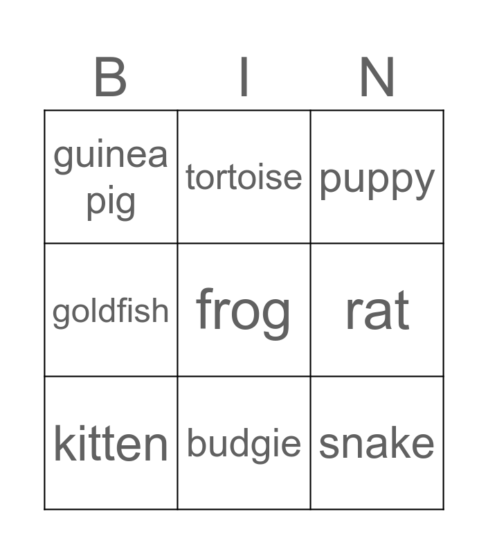 This bingo card has 9 words: kitten, puppy, tortoise, goldfish, guinea pig, rat, frog, snake and budgie.