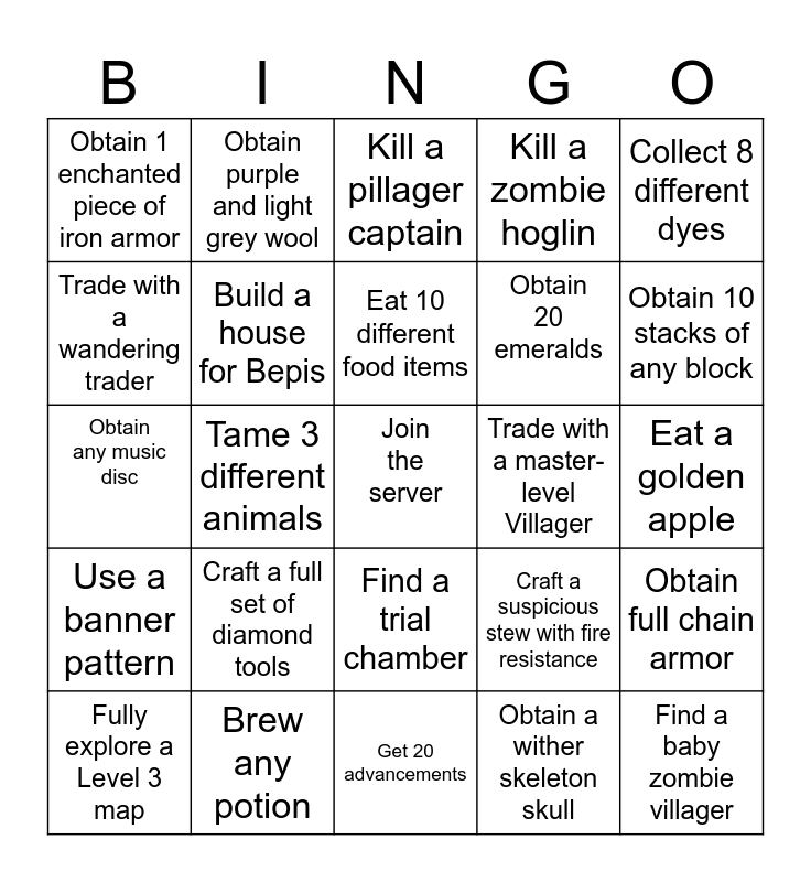 This bingo card has a free space and 24 words: Craft a full set of diamond tools, Brew any potion, Eat 10 different food items, Fully explore a Level 3 map, Collect 8 different dyes, Obtain 1 enchanted piece of iron armor, Trade with a wandering trader, Obtain purple and light grey wool, Trade with a master-level Villager, Find a trial chamber, Obtain 20 emeralds, Obtain any music disc, Craft a suspicious stew with fire resistance, Obtain full chain armor, Build a house for Bepis, Obtain a wither skeleton skull, Eat a golden apple, Kill a pillager captain, Obtain 10 stacks of any block, Tame 3 different animals, Find a baby zombie villager, Use a banner pattern, Kill a zombie hoglin and Get 20 advancements.