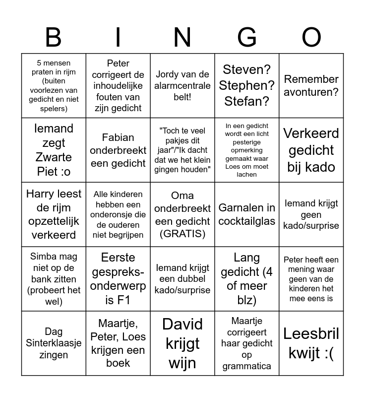 This bingo card has a free space and 24 words: Eerste gespreks- onderwerp is F1, Maartje, Peter, Loes krijgen een boek, "Toch te veel pakjes dit jaar"/"Ik dacht dat we het klein gingen houden", Dag Sinterklaasje zingen, Remember avonturen?, 5 mensen praten in rijm (buiten voorlezen van gedicht en niet spelers), Iemand zegt Zwarte Piet :o, Peter corrigeert de inhoudelijke fouten van zijn gedicht, Garnalen in cocktailglas, Iemand krijgt een dubbel kado/surprise, In een gedicht wordt een licht pesterige opmerking gemaakt waar Loes om moet lachen, Harry leest de rijm opzettelijk verkeerd, Lang gedicht (4 of meer blz), Peter heeft een mening waar geen van de kinderen het mee eens is, Fabian onderbreekt een gedicht, Maartje corrigeert haar gedicht op grammatica, Iemand krijgt geen kado/surprise, Jordy van de alarmcentrale belt!, Verkeerd gedicht bij kado, Alle kinderen hebben een onderonsje die de ouderen niet begrijpen, Leesbril kwijt :(, Simba mag niet op de bank zitten (probeert het wel), Steven?Stephen? Stefan? and David krijgt wijn.
