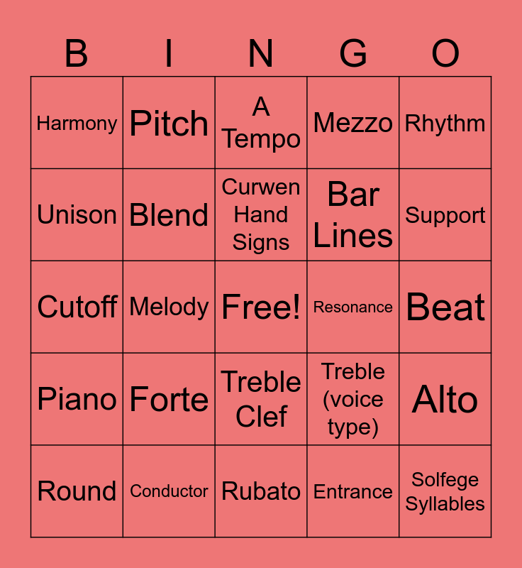 This bingo card has a free space and 66 words: Choir, Ensemble, Soprano, Alto, Tenor, Bass, Pitch, Solfege, Curwen Hand Signs, Staff, Treble Clef, Note, Beat, Rhythm, Rest, Unison, Melody, Harmony, Measure, Bar Lines, Forte, Piano, Mezzo, Crescendo, Decrescendo, Intonation, Timbre, Rhythm Syllables, Solfege Syllables, Tonic Triad, Round, Canon, Consonants, Cambiata, Treble (voice type), Conductor, Score, Cutoff, Entrance, Tone Quality, Blend, Balance, Resonance, Diction, Vowel Shape, Breathing (Appoggio), Support, Posture, Articulation, Legato, Staccato, Accent, Slur, Tenuto, Phrase, Tempo, Accelerando, Ritardando, A Tempo, Rubato, Metronome Marking, Key Signature, Flat, Sharp, Natural and Tie.