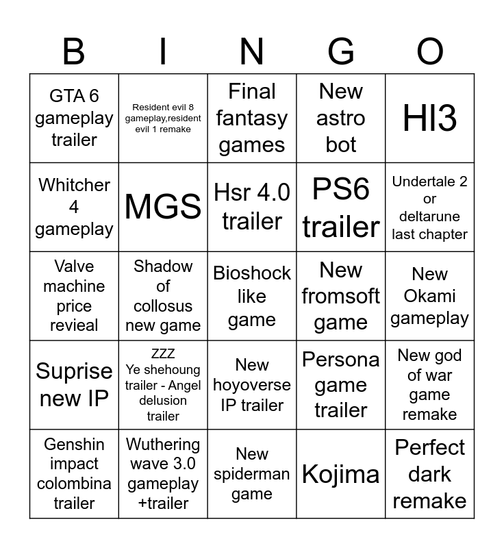 This bingo card has a free space and 24 words: ZZZ Ye shehoung trailer - Angel delusion trailer, Wuthering wave 3.0 gameplay +trailer, Hsr 4.0 trailer, Genshin impact colombina trailer, Hl3, GTA 6 gameplay trailer, Whitcher 4 gameplay, Resident evil 8 gameplay,resident evil 1 remake, New fromsoft game, New hoyoverse IP trailer, PS6 trailer, Valve machine price revieal, Persona game trailer, New god of war game remake, MGS, Kojima, New Okami gameplay, Final fantasy games, Undertale 2 or deltarune last chapter, Shadow of collosus new game, Perfect dark remake, Suprise new IP, New astro bot and New spiderman game.