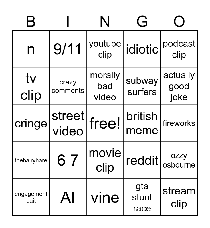 This bingo card has a free space and 24 words: 6 7, AI, morally bad video, engagement bait, podcast clip, n, tv clip, 9/11, british meme, movie clip, subway surfers, cringe, reddit, ozzy osbourne, crazy comments, gta stunt race, fireworks, youtube clip, actually good joke, street video, stream clip, thehairyhare, idiotic and vine.