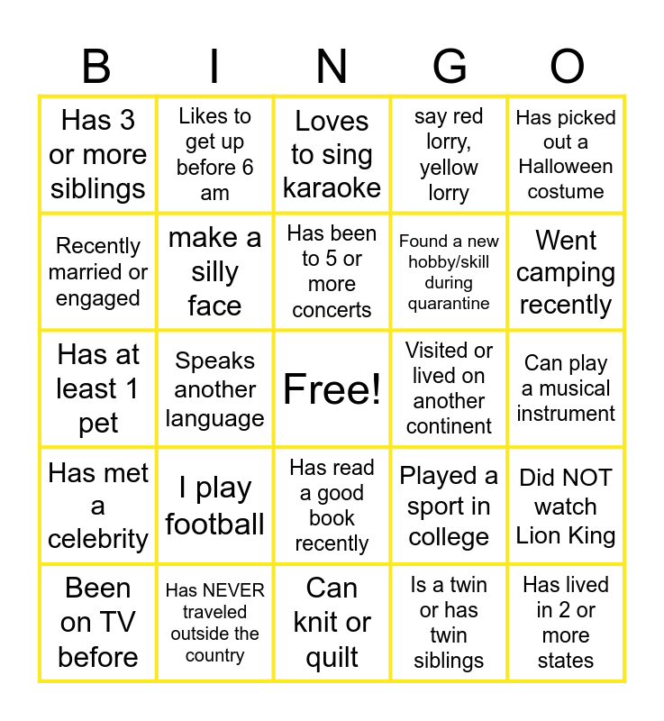 This bingo card has a free space and 40 words: being a teacher is your dream job, Speaks another language, name 2 countries, Visited or lived on another continent, I have pets, Been on TV before, make a silly face, like eating crabs, Found a new hobby/skill during quarantine, Did NOT watch Lion King, Has at least 1 pet, Likes to get up before 6 am, Is a twin or has twin siblings, Can play a musical instrument, Has met a celebrity, I play football, I don't watch T.V, say red lorry, yellow lorry, Knew a celebrity BEFORE they were famous, Has 3 or more siblings, Has NEVER traveled outside the country, Has been to 5 or more concerts, Played a sport in college, Went camping recently, Has hosted a virtual Happy Hour, Can drive a manual car, Can knit or quilt, Has broken 2 or more bones, Has never been on a plane, Never swears, Failed your first driving test, Loves to sing karaoke, Graduated high school early, Has lived in 2 or more states, Recently married or engaged, Doesn’t have any social media, Has read a good book recently, Loves true crime shows or podcasts, Has picked out a Halloween costume and Is an only child.