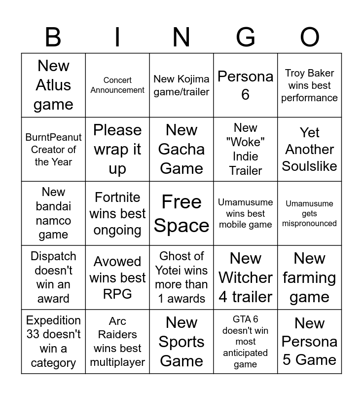 This bingo card has a free space and 39 words: Kojima Glazing, Famous Actor, Long Speech, Please wrap it up, Expedition 33 doesn't win a category, Ghost of Yotei wins more than 1 awards, New Gacha Game, Silksong wins an award, Troy Baker wins best performance, Dispatch doesn't win an award, Fortnite wins best ongoing, Persona 6, New Persona 5 Game, Umamusume gets mispronounced, Umamusume wins best mobile game, Avowed wins best RPG, Last of Us S2 wins best adaptation, New Atlus game, New GTA 6 trailer, New Witcher 4 trailer, BurntPeanut Creator of the Year, New Sports Game, New "Woke" Indie Trailer, Yet Another Soulslike, Something from Xbox, Steal a Brainrot wins best Fortnite Map, NRG wins best ESports Team, Someone we didn't want wins an award, Expedition 33 doesn't win best music, Concert Announcement, Lost music pause before award (GOTY doesn't count), Movie announcement, New Kojima game/trailer, Arc Raiders wins best multiplayer, GTA 6 doesn't win most anticipated game, Split Fiction wins an award, New farming game, New bandai namco game and New ubisoft game.