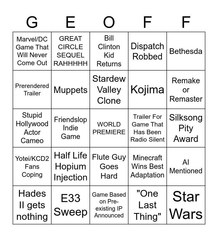 This bingo card has a free space and 24 words: Half Life Hopium Injection, E33 Sweep, Stardew Valley Clone, Hades II gets nothing, Bethesda, Marvel/DC Game That Will Never Come Out, Prerendered Trailer, GREAT CIRCLE SEQUEL RAHHHHH, Trailer For Game That Has Been Radio Silent, Flute Guy Goes Hard, Kojima, Stupid Hollywood Actor Cameo, Minecraft Wins Best Adaptation, AI Mentioned, Muppets, "One Last Thing", Silksong Pity Award, Bill Clinton Kid Returns, Remake or Remaster, Friendslop Indie Game, Star Wars, Yotei/KCD2 Fans Coping, Dispatch Robbed and Game Based on Pre-existing IP Announced.