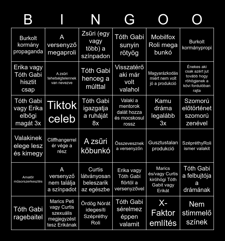 This bingo card has 36 words: Erika vagy Tóth Gabi flörtöl a versenyzővel, Curtis látványosan beleszarik az egészbe, Tóth Gabi sérelmez éppen valamit, Erika vagy Tóth Gabi hisztit csap, Valakinek elege lesz és kimegy, Valaki a mentorok dalát hozza és mocskosul rossz, A zsűri tehetségtelennek van nevezve, Ördög Nórát idegesíti Szépréthy Roli, Mobilfox Roli mega bunkó, Marics és/vagy Curtis kiröhögi Tóth Gabit vagy Erikát, Énekes aki csak azért jut tovább hogy röhögjenek a kövi fordulóban rajta, Tóth Gabi sunyin rötyög, Tóth Gabi a felbujtója a drámának, Tiktok celeb, Visszatérő aki már volt valahol, Burkolt kormány propaganda, Amatőr műsorszerkesztés, Kamu dráma legalább 3x, Tóth Gabi vagy Erika elbőgi magát 3x, Zsűri (egy vagy több) a színpadon, Tóth Gabi igazgatja a ruháját 8x, Cliffhangerrel ér vége a rész, Összevesznek a versenyzőn, A zsűri kőbunkó, Gusztustalan produkció, A versenyző megaproli, Magyarázkodás miért nem volt jó a produkció, Marics Peti vagy Curtis szexuális megjegyzést tesz Erikának, Tóth Gabi henceg a múlttal, Burkolt kormánypropi, Nem stimmelő színek, Tóth Gabi ragebaitel, SzépréthyRoli ismer valakit, Szomorú előtörténet szomorú zenével, A versenyző nem találja a színpadot and X-Faktor említés.