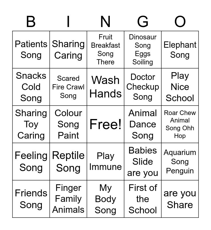This bingo card has a free space and 44 words: Playtime Song, are you Share, Jump Rope, Friends Song, Wheels on the bus, First of the School, Fruit Breakfast Song There, Class Pets Song, Elephant Song, Finger Family Animals, Dinosaur Song Eggs Soiling, Animal Dance Song, Play Immune, Reptile Song, Like School, My Body Song, are you Lying Baby John, Sharing Toy Caring, Dinosaur Song, Play Nice School, Sharing Caring, Safety Safe Song, Art Craft Song, Patients Song, Five Senses, Roar Chew Animal Song Ohh Hop, Animal Song Show Dog, Color Shape Song Build, Babies Slide are you, Feeling Song, Jobs and Song Career, Aquarium Song Penguin, Playground Song Swing, Babies Pool Song, Colour Song Paint, Hoop Twirl Balance Song, Kind Bridge Falling Down, Swimming Song, Wash Hands, Snacks Cold Song, Doctor Checkup Song, Dance Baby Chicken, Scared Fire Crawl Song and Trash Recycle Song.