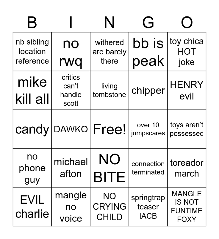 This bingo card has a free space and 24 words: michael afton, mangle no voice, living tombstone, EVIL charlie, toy chica HOT joke, nb sibling location reference, mike kill all, no rwq, over 10 jumpscares, NO BITE, chipper, candy, connection terminated, toreador march, critics can’t handle scott, springtrap teaser IACB, toys aren’t possessed, withered are barely there, HENRY evil, DAWKO, MANGLE IS NOT FUNTIME FOXY, no phone guy, bb is peak and NO CRYING CHILD.