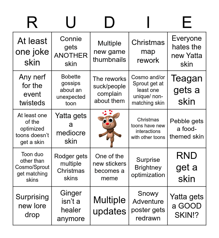 This bingo card has a free space and 24 words: Rodger gets multiple Christmas skins, Ginger isn’t a healer anymore, The reworks suck/people complain about them, Surprising new lore drop, Everyone hates the new Yatta skin, At least one joke skin, Any nerf for the event twisteds, Connie gets ANOTHER skin, Christmas toons have new interactions with other toons, One of the new stickers becomes a meme, Cosmo and/or Sprout get at least one unique/ non-matching skin, At least one of the optimized toons doesn’t get a skin, Surprise Brightney optimization, RND get a skin, Bobette gossips about an unexpected toon, Snowy Adventure poster gets redrawn, Pebble gets a food-themed skin, Multiple new game thumbnails, Teagan gets a skin, Yatta gets a mediocre skin, Yatta gets a GOOD SKIN!?, Toon duo other than Cosmo/Sprout get matching skins, Christmas map rework and Multiple updates.