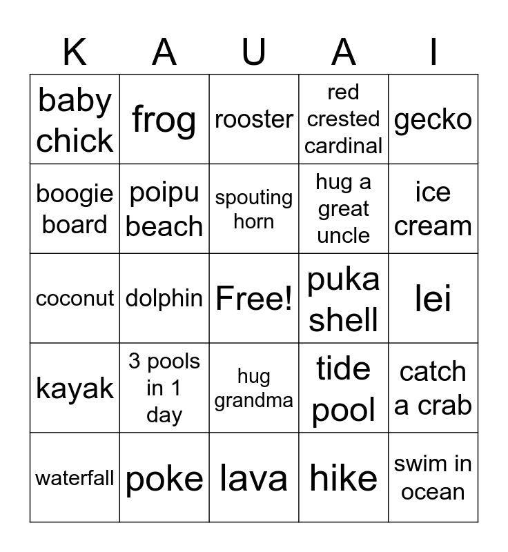 This bingo card has a free space and 30 words: poke, sea turtle, dolphin, whale tail, baby chick, rooster, poipu beach, hug grandma, puka shell, lava, lei, swim in ocean, hike, sandcastle, ice cream, shave ice, tide pool, kayak, 3 pools in 1 day, gecko, coconut, pineapple, frog, hug a great uncle, boogie board, red crested cardinal, catch a crab, waterfall, spouting horn and snorkel.