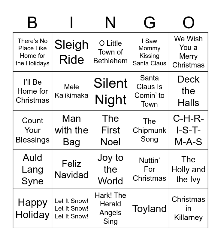 This bingo card has 75 words: White Christmas, A Holly Jolly Christmas, Silent Night, Rudolph the Red-Nosed Reindeer, Little Drummer Boy, The Christmas Song, Rockin’ Around the Christmas Tree, O Holy Night, Frosty the Snowman, Do You Hear What I Hear?, Have Yourself a Merry Little Christmas, Jingle Bell Rock, Joy to the World, Santa Claus Is Comin’ to Town, The Twelve Days of Christmas, I’ll Be Home for Christmas, Let It Snow! Let It Snow! Let It Snow!, Hark! The Herald Angels Sing, Here Comes Santa Claus, Deck the Halls, It’s Beginning to Look a Lot Like Christmas, Sleigh Ride, The First Noel, I Saw Mommy Kissing Santa Claus, We Wish You a Merry Christmas, Silver Bells, Marshmallow World, O Come All Ye Faithful, All I Want for Christmas Is My Two Front Teeth, Pretty Paper, Blue Christmas, Santa Baby, God Rest Ye Merry Gentlemen, Nuttin’ For Christmas, C-H-R-I-S-T-M-A-S, There’s No Place Like Home for the Holidays, Jingle Bells, What Child Is This?, The Chipmunk Song, Christmas in Killarney, It’s the Most Wonderful Time of the Year, Run Rudolph Run, Away in a Manger, Dominick the Donkey, Mary’s Boy Child, Winter Wonderland, Man with the Bag, O Little Town of Bethlehem, You’re a Mean One Mr. Grinch, O Christmas Tree, Mistletoe and Holly, Mele Kalikimaka, It Came Upon the Midnight Clear, I Want a Hippopotamus for Christmas, Good King Wenceslas, Merry Christmas Darling, Baby It’s Cold Outside, Angels We Have Heard on High, Suzy Snowflake, I Heard the Bells on Christmas Day, Happy Holiday, Cool Yule, We Three Kings, Up on the Housetop, Carol of the Bells, Count Your Blessings, That’s What Christmas Means to Me, Ave Maria, Jolly Old Saint Nicholas, The Holly and the Ivy, Auld Lang Syne, Feliz Navidad, Go Tell It on the Mountain, Toyland and Amazing Grace.