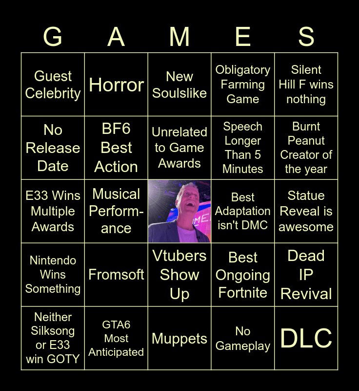 This bingo card has a free space and 29 words: Neither Silksong or E33 win GOTY, Hideo Kojima Appears, Musical Perform- ance, BF6 Best Multiplayer, Guest Celebrity, New Soulslike, BF6 Best Action, Fromsoft, Best Adaptation isn't DMC, GTA6 Most Anticipated, Statue Reveal is awesome, DLC, Muppets, No Gameplay, Burnt Peanut Creator of the year, Remake Remaster, Vtubers Show Up, Nintendo Wins Something, Silent Hill F wins nothing, E33 Wins Multiple Awards, Best Ongoing Fortnite, Yotei Best Perform- ance, Speech Longer Than 5 Minutes, No Release Date, Obligatory Farming Game, Horror, Dead IP Revival, Unrelated to Game Awards and Sony.