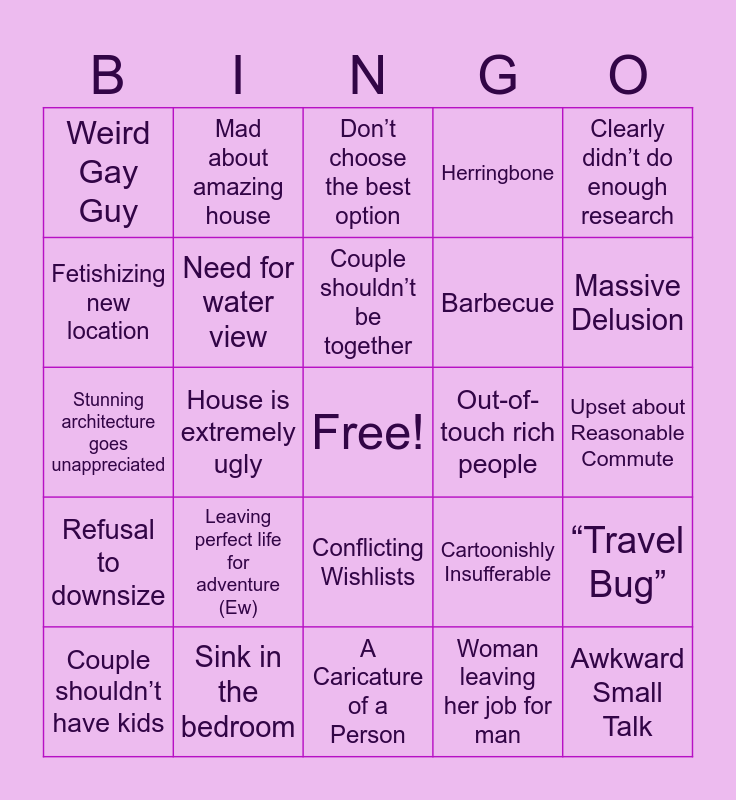This bingo card has a free space and 34 words: Unreasonable Price Range, Woman leaving her job for man, Realtor visibly annoyed, Husband has “hates his wife” disease, Refusal to downsize, Need for water view, Clearly didn’t do enough research, Couple shouldn’t have kids, Mad about amazing house, Millenial grey decor, Couple shouldn’t be together, Don’t choose the best option, Unreasonable woman pragmatic man, Upset about size/ existence of appliances, Out-of-touch rich people, Massive Delusion, Sink in the bedroom, Stunning architecture goes unappreciated, Leaving perfect life for adventure (Ew), Cartoonishly Insufferable, Conflicting Wishlists, Internally Conflicting Wishlist, Weird Gay Guy, Upset about Reasonable Commute, A Caricature of a Person, Awkward Small Talk, Herringbone, Save Money for Traveling, Barbecue, Fetishizing new location, Contributing to Gentrification, House is extremely ugly, “Travel Bug” and Realtor has to hang out with them.