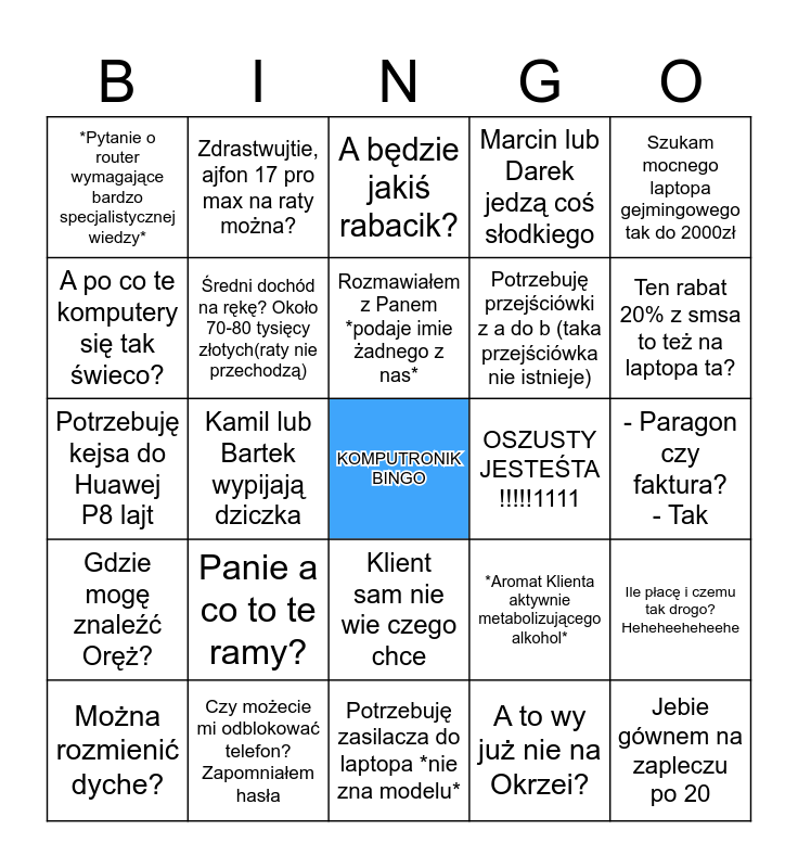 This bingo card has a free space and 24 words: Panie a co to te ramy?, Czy możecie mi odblokować telefon? Zapomniałem hasła, Rozmawiałem z Panem *podaje imie żadnego z nas*, Można rozmienić dyche?, Szukam mocnego laptopa gejmingowego tak do 2000zł, *Pytanie o router wymagające bardzo specjalistycznej wiedzy*, A po co te komputery się tak świeco?, Zdrastwujtie, ajfon 17 pro max na raty można?, OSZUSTY JESTEŚTA !!!!!1111, Klient sam nie wie czego chce, Potrzebuję przejściówki z a do b (taka przejściówka nie istnieje), Potrzebuję kejsa do Huawej P8 lajt, *Aromat Klienta aktywnie metabolizującego alkohol*, Ile płacę i czemu tak drogo? Heheheeheheehe, Średni dochód na rękę? Około 70-80 tysięcy złotych(raty nie przechodzą), A to wy już nie na Okrzei?, - Paragon czy faktura? - Tak, A będzie jakiś rabacik?, Ten rabat 20% z smsa to też na laptopa ta?, Kamil lub Bartek wypijają dziczka, Jebie gównem na zapleczu po 20, Gdzie mogę znaleźć Oręż?, Marcin lub Darek jedzą coś słodkiego and Potrzebuję zasilacza do laptopa *nie zna modelu*.