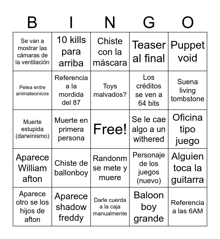 This bingo card has a free space and 24 words: Chiste de ballonboy, Aparece shadow freddy, Toys malvados?, Aparece otro se los hijos de afton, Puppet void, Se van a mostrar las cámaras de la ventilación, Pelea entre animateonicos, 10 kills para arriba, Se le cae algo a un withered, Randonm se mete y muere, Los créditos se ven a 64 bits, Muerte estupida (darwinismo), Personaje de los juegos (nuevo), Alguien toca la guitarra, Referencia a la mordida del 87, Baloon boy grande, Oficina tipo juego, Chiste con la máscara, Suena living tombstone, Muerte en primera persona, Referencia a las 6AM, Aparece William afton, Teaser al final and Darle cuerda a la caja manualmente.