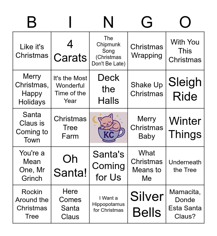 This bingo card has a free space and 67 words: All I Want for Christmas is You, Last Christmas, Santa Tell Me, Underneath the Tree, My Only Wish (This Year), Cold December Night, 4 Carats, Hard Candy Christmas, Deck the Halls, Greatest Time of Year, Santa's Coming for Us, Mistletoe, Winter Things, With You This Christmas, Make it To Christmas, Merry Christmas, Happy Holidays, Christmas Tree Farm, Like it's Christmas, Christmas Every Day, Shake Up Christmas, Oh Santa!, You're a Mean One, Mr Grinch, Christmas Wrapping, Silver Bells, You Make it Feel Like Christmas, Cuddle Up, Cozy Down Christmas, Santa Can't You Hear Me, Kiss Me Babe, It's Christmas Time, Sleigh Ride, Winter Wonderland, Mamacita, Donde Esta Santa Claus?, Zat You, Santa Claus?, That Christmas Morning Feelin', Carol of the Bells, Jingle Bell Rock, Rockin Around the Christmas Tree, It's Beginning to Look a Lot Like Christmas, What Christmas Means to Me, Santa Claus is Coming to Town, A Holly Jolly Christmas, White Christmas, It's the Most Wonderful Time of the Year, Merry Christmas Baby, Frosty the Snowman, Run Rudolph Run, Little Saint Nick, Rudolph the Red-Nosed Reindeer, Here Comes Santa Claus, Mele Kelikimaka, Santa Baby, The Chipmunk Song (Christmas Don't Be Late), This Christmas, Feliz Navidad, I Saw Mommy Kissing Santa Claus, Let it Snow! Let it Snow! Let it Snow!, I Want a Hippopotamus for Christmas, Who Spiked the Eggnog?, Christmas Beers, 1 Wish, All I Want for Christmas is a Cowboy, Al I Want for Christmas is My Two Front Teeth, Closer to Christmas, Everybody's Waitin for the Man with the Bag, Merry Christmas, Grandma Got Run Over by a Reindeer, It Feels Like Christmas and S-N-O-W.