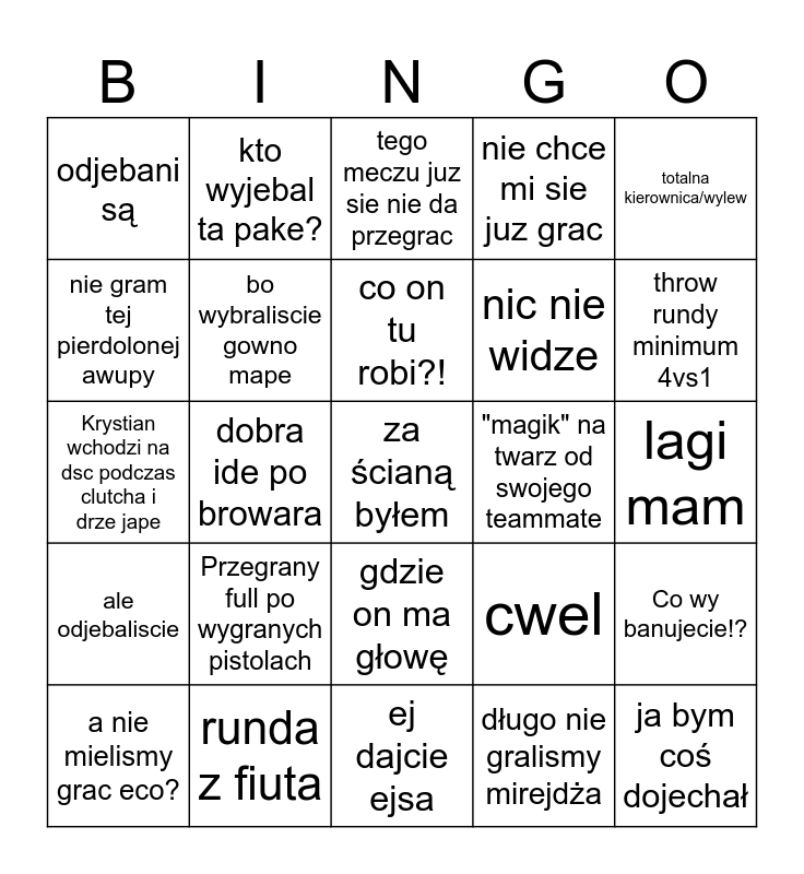 This bingo card has 25 words: Przegrany full po wygranych pistolach, ej dajcie ejsa, co on tu robi?!, a nie mielismy grac eco?, totalna kierownica/wylew, odjebani są, nie gram tej pierdolonej awupy, kto wyjebal ta pake?, "magik" na twarz od swojego teammate, gdzie on ma głowę, nic nie widze, Krystian wchodzi na dsc podczas clutcha i drze jape, cwel, Co wy banujecie!?, bo wybraliscie gowno mape, ja bym coś dojechał, lagi mam, tego meczu juz sie nie da przegrac, throw rundy minimum 4vs1, dobra ide po browara, za ścianą byłem, runda z fiuta, ale odjebaliscie, nie chce mi sie juz grac and długo nie gralismy mirejdża.