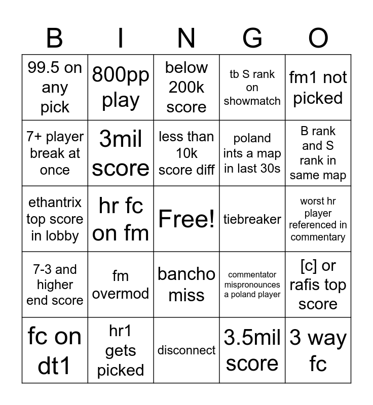 This bingo card has a free space and 24 words: fm overmod, hr1 gets picked, less than 10k score diff, fc on dt1, fm1 not picked, 99.5 on any pick, 7+ player break at once, 800pp play, tiebreaker, bancho miss, poland ints a map in last 30s, ethantrix top score in lobby, commentator mispronounces a poland player, [c] or rafis top score, 3mil score, 3.5mil score, worst hr player referenced in commentary, below 200k score, B rank and S rank in same map, hr fc on fm, 3 way fc, 7-3 and higher end score, tb S rank on showmatch and disconnect.