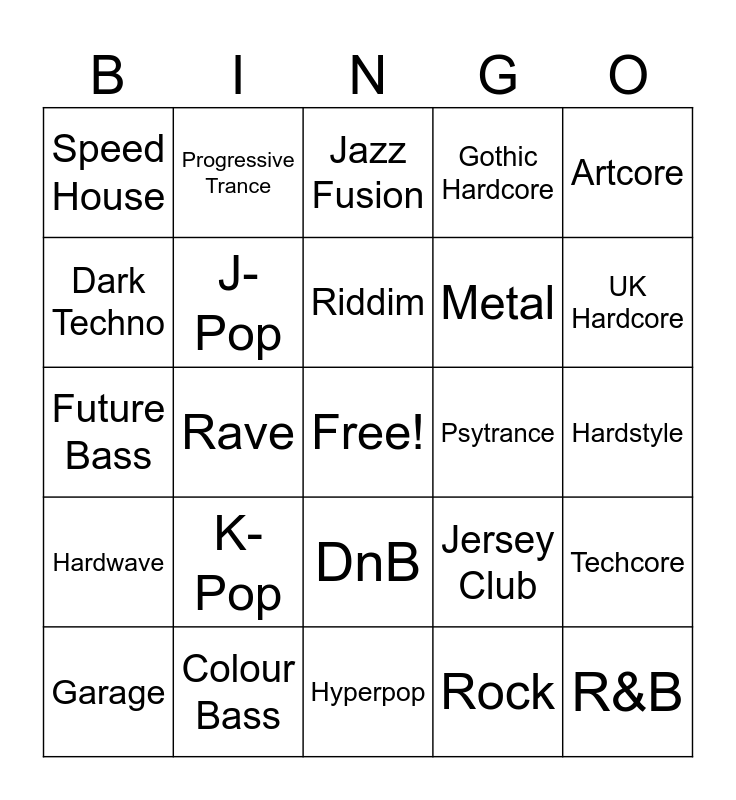 This bingo card has a free space and 24 words: K-Pop, Colour Bass, Riddim, Garage, Artcore, Speed House, Dark Techno, Progressive Trance, Psytrance, DnB, Metal, Future Bass, Jersey Club, Techcore, J-Pop, Rock, Hardstyle, Jazz Fusion, UK Hardcore, Rave, R&B, Hardwave, Gothic Hardcore and Hyperpop.
