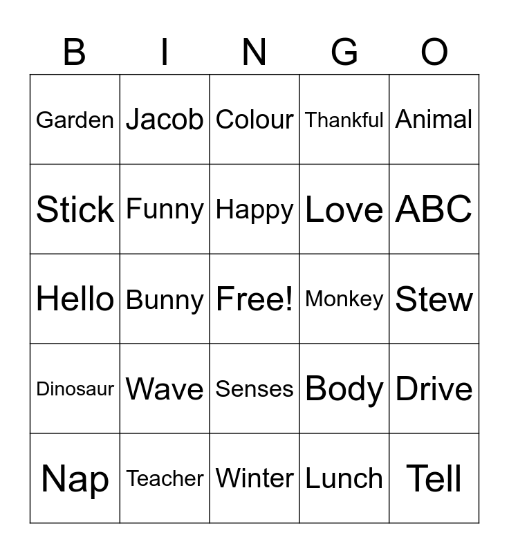 This bingo card has a free space and 34 words: School, Lunch, Happen, Pets, Dinosaur, Funny, Animal, Nap, Jacob, Music, Happy, Colour, Station, Yoga, Monkey, ABC, Teacher, Hello, Wave, Body, Senses, Drill, Garden, Stew, Winter, Tell, Thankful, Clean, Love, Stick, Birthday, Bunny, Drive and Chick.