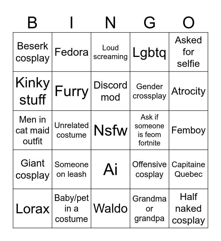 This bingo card has a free space and 24 words: Someone on leash, Baby/pet in a costume, Discord mod, Lorax, Asked for selfie, Beserk cosplay, Kinky stuff, Fedora, Ask if someone is feom fortnite, Ai, Gender crossplay, Men in cat maid outfit, Offensive cosplay, Capitaine Quebec, Furry, Grandma or grandpa, Femboy, Loud screaming, Atrocity, Unrelated costume, Half naked cosplay, Giant cosplay, Lgbtq and Waldo.