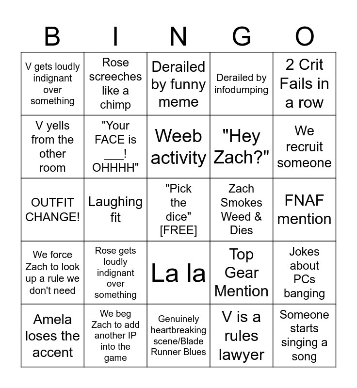This bingo card has a free space and 27 words: Top Gear Mention, FreakLLUS, "Hey Zach?", Genuinely heartbreaking scene/Blade Runner Blues, V yells from the other room, Derailed by funny meme, Rose screeches like a chimp, We force Zach to look up a rule we don't need, Zach Smokes Weed & Dies, Jokes about PCs banging, OUTFIT CHANGE!, Derailed by infodumping, Amela loses the accent, We beg Zach to add another IP into the game, We recruit someone, "Do you guys wanna play Cyberpunk?", "Your FACE is ___! OHHHH", Weeb activity, Rose gets loudly indignant over something, V gets loudly indignant over something, FNAF mention, V is a rules lawyer, Laughing fit, Someone starts singing a song, La la, 2 Crit Fails in a row and "Hi ___ I'm Amela!".