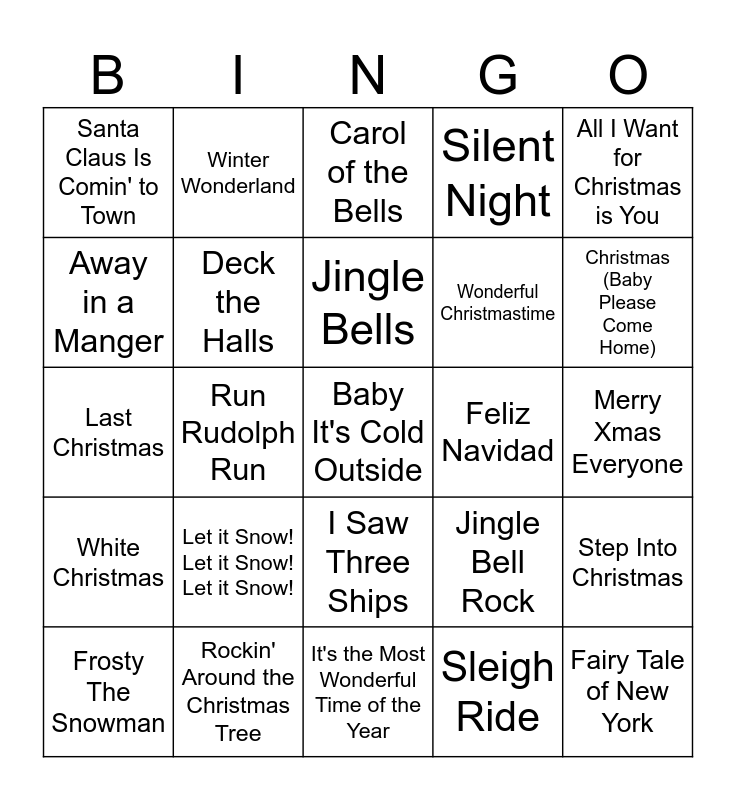 This bingo card has 35 words: Good King Wenceslas, Hark! The Harold Angles Sing, Joy to the World, Deck the Halls, I Saw Three Ships, Silent Night, Away in a Manger, We Wish You a Merry Christmas, Jingle Bells, O Christmas Tree, Last Christmas, All I Want for Christmas is You, Santa Tell Me, Holly Jolly Christmas, Santa Claus Is Comin' to Town, Feliz Navidad, Sleigh Ride, Run Rudolph Run, White Christmas, Baby It's Cold Outside, Jingle Bell Rock, Frosty The Snowman, Step Into Christmas, Rockin' Around the Christmas Tree, Carol of the Bells, Christmas (Baby Please Come Home), Fairy Tale of New York, Do They Know It's Christmas, Wonderful Christmastime, Merry Xmas Everyone, Merry Christmas Everyone, It's the Most Wonderful Time of the Year, Let it Snow! Let it Snow! Let it Snow!, Winter Wonderland and 2000 Miles.
