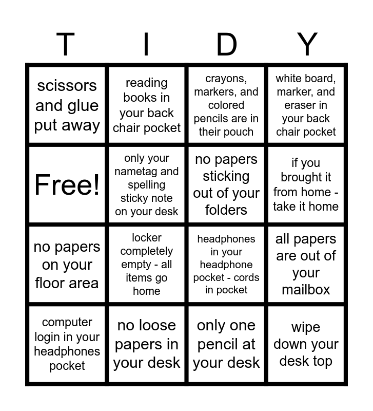 This bingo card has 16 words: no loose papers in your desk, all papers are out of your mailbox, crayons, markers, and colored pencils are in their pouch, scissors and glue put away, no papers on your floor area, reading books in your back chair pocket, headphones in your headphone pocket - cords in pocket, only one pencil at your desk, Free!, only your nametag and spelling sticky note on your desk, computer login in your headphones pocket, white board, marker, and eraser in your back chair pocket, locker completely empty - all items go home, if you brought it from home - take it home, no papers sticking out of your folders and wipe down your desk top.