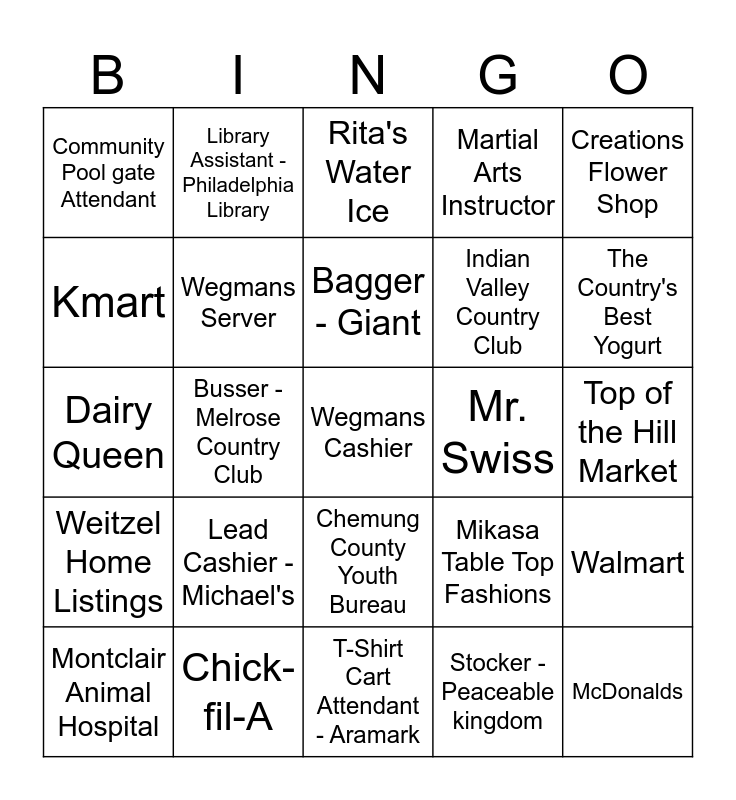This bingo card has a free space and 24 words: Lead Cashier - Michael's, Chick-fil-A, Bagger - Giant, Montclair Animal Hospital, Creations Flower Shop, Community Pool gate Attendant, Kmart, Library Assistant - Philadelphia Library, Mr. Swiss, Chemung County Youth Bureau, Indian Valley Country Club, Dairy Queen, Mikasa Table Top Fashions, Walmart, Wegmans Server, Stocker - Peaceable kingdom, Top of the Hill Market, Rita's Water Ice, The Country's Best Yogurt, Busser - Melrose Country Club, McDonalds, Weitzel Home Listings, Martial Arts Instructor and T-Shirt Cart Attendant - Aramark.