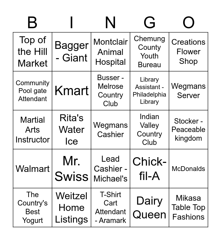 This bingo card has a free space and 24 words: Mr. Swiss, Weitzel Home Listings, Busser - Melrose Country Club, The Country's Best Yogurt, Creations Flower Shop, Top of the Hill Market, Community Pool gate Attendant, Bagger - Giant, Indian Valley Country Club, Lead Cashier - Michael's, Library Assistant - Philadelphia Library, Martial Arts Instructor, Chick-fil-A, McDonalds, Kmart, Dairy Queen, Stocker - Peaceable kingdom, Montclair Animal Hospital, Wegmans Server, Rita's Water Ice, Mikasa Table Top Fashions, Walmart, Chemung County Youth Bureau and T-Shirt Cart Attendant - Aramark.
