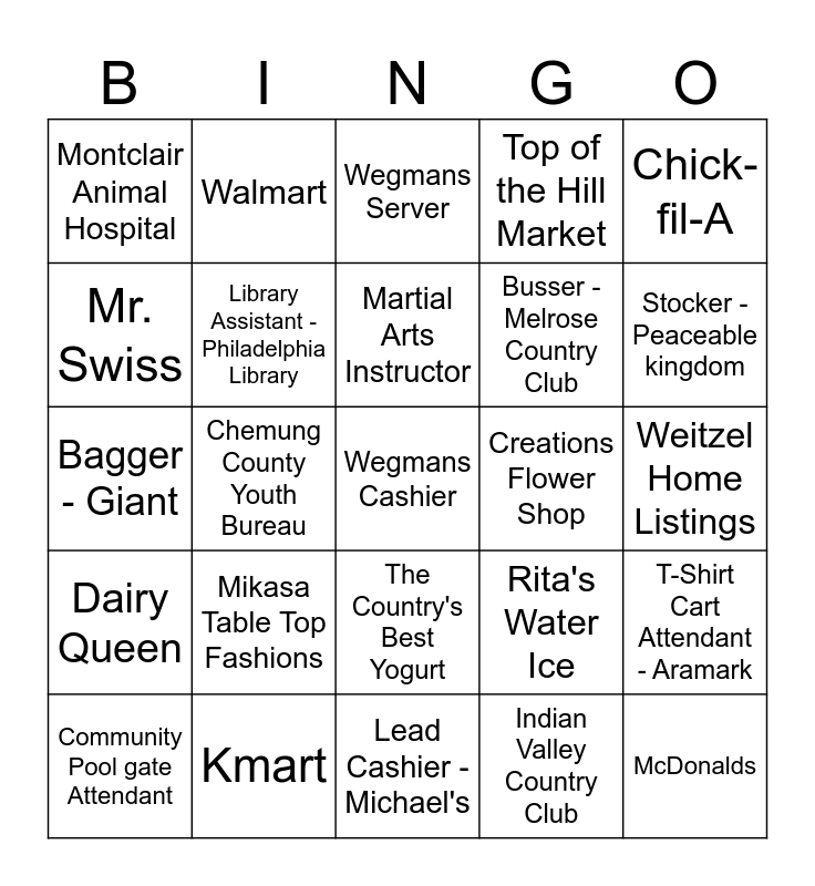 This bingo card has a free space and 24 words: Mikasa Table Top Fashions, Kmart, Martial Arts Instructor, Community Pool gate Attendant, Chick-fil-A, Montclair Animal Hospital, Mr. Swiss, Walmart, Creations Flower Shop, The Country's Best Yogurt, Busser - Melrose Country Club, Bagger - Giant, Rita's Water Ice, T-Shirt Cart Attendant - Aramark, Library Assistant - Philadelphia Library, Indian Valley Country Club, Weitzel Home Listings, Wegmans Server, Stocker - Peaceable kingdom, Chemung County Youth Bureau, McDonalds, Dairy Queen, Top of the Hill Market and Lead Cashier - Michael's.