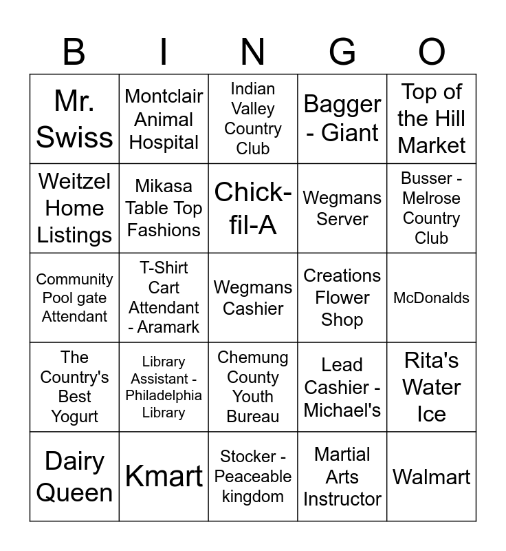 This bingo card has a free space and 24 words: Library Assistant - Philadelphia Library, Kmart, Chick-fil-A, Dairy Queen, Top of the Hill Market, Mr. Swiss, Weitzel Home Listings, Montclair Animal Hospital, Creations Flower Shop, Chemung County Youth Bureau, Wegmans Server, Community Pool gate Attendant, Lead Cashier - Michael's, Rita's Water Ice, Mikasa Table Top Fashions, Martial Arts Instructor, McDonalds, Indian Valley Country Club, Busser - Melrose Country Club, T-Shirt Cart Attendant - Aramark, Walmart, The Country's Best Yogurt, Bagger - Giant and Stocker - Peaceable kingdom.